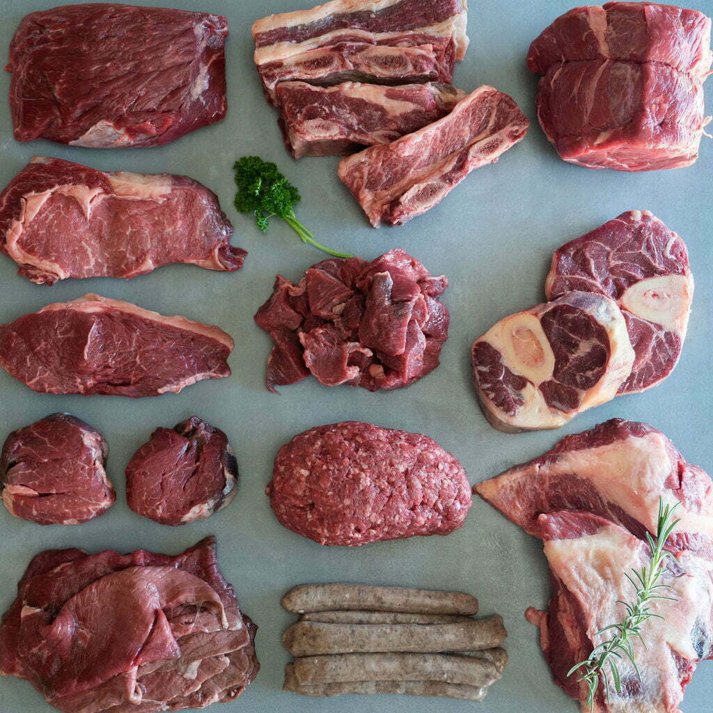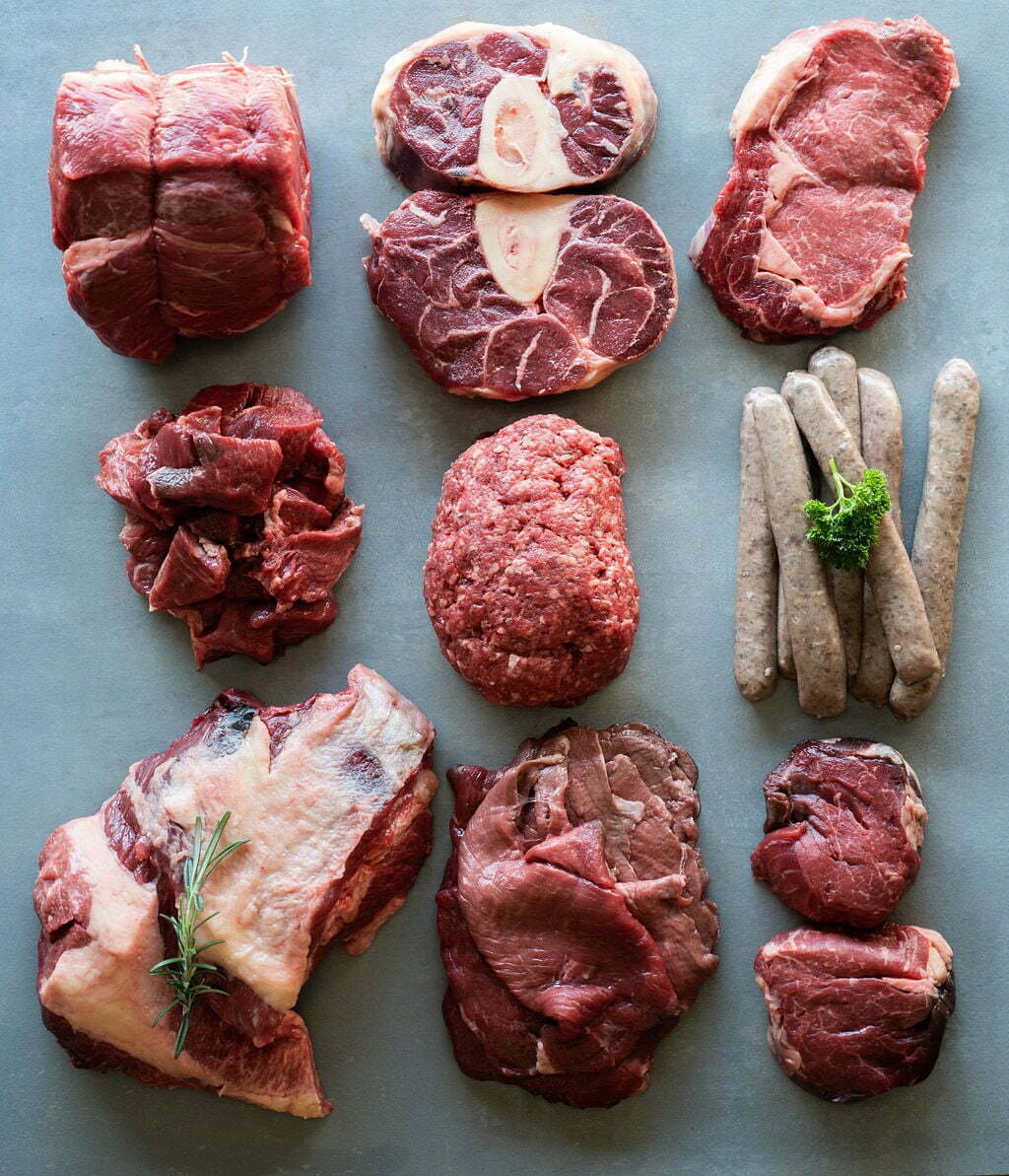 Rib Eye or Fillet Steak / Striploin Steak / Rump Steak / Schnitzel / Beef Roast / Short Ribs or Ossobuco / Brisket or Cross Cut Blade / Premium Mince / Diced Beef / Sausages